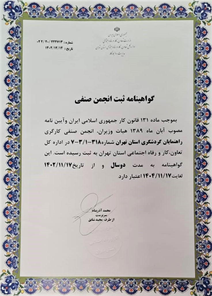 انجمن صنفی راهنمایان گردشگری استان تهران در بهار ۱۳۸۷ با هدف پی گیری حقوق راهنمایان گردشگری تشکیل شده است. ایجاد تعامل با دیگر تشکلهای گردشگری همچون آژانسهای مسافرتی، هتلها و سایر مجموعههای مرتبط، ایجاد زمینه اشتغال برای راهنمایان گردشگری و انسجام قانونی در تبیین نوع وظایف و فعالیتهای راهنمایان گردشگری از اهداف این انجمن است.